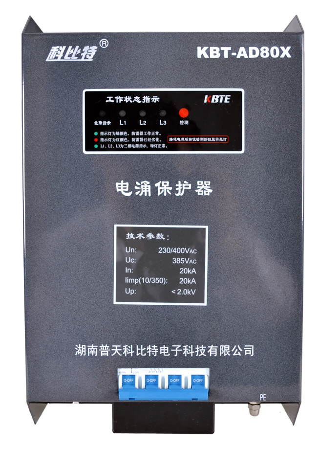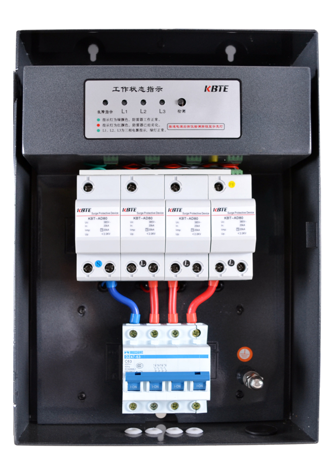 三相电源防雷箱内部安装的是符合GB18802.1-2011《低压电涌保护器(SPD) 第1部分 低压配电系统的保护器性能要求和试验方法》标准要求的电源防雷模块,其中KBT-AD系列配置的电源防雷模块为I级试验(T1)电涌保护器,用于第一级雷电防护,KBT-BD和KBT-CD系列配置的电源防雷模块为II级试验(T2)电涌保护器,分别用于第二级和第三级雷电防护。适合TT、TN-C、TN-C-S等各种电网制式的三相电源系统,防止雷击产生的脉冲浪涌及瞬间过电压对用电设备造成损害。该系列电源防雷箱并联安装在电源线路上,不影响电源线路的正常工作。